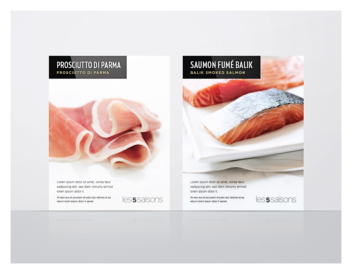 À titre de directeur de création pigiste, j'ai revu l'image de marque Les 5 Saisons, Épicerie fine depuis 1985 par Metro. J'ai ensuite décliné cette nouvelle image sur différents médiums en magasin et créé la nouvelle grille graphique de leur circulaire.